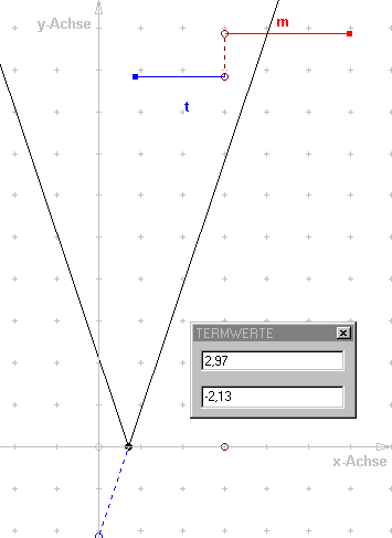 Ausgehend von der Betrachtung der Funktionen mit der Gleichung y = | mx | + t kann sich die Diskussion der Graphen zu y = | mx + t | anschließen. Interessant ist hier die Beobachtung der Lage des gemeinsamen Anfangspunkts der Halbgeraden. Die Abhängigkeit der Lage dieses Punktes sowohl