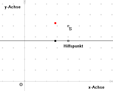 - Er zeichnet nun eine Parallele durch den Hilfspunkt zur x-Achse und