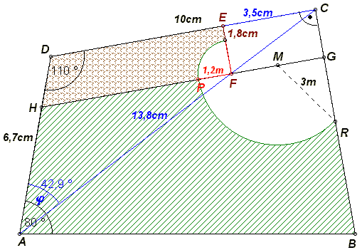 nämlich r = 3m - 1,8m = 1,2m. Der Sektorwinkel misst 90°.