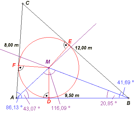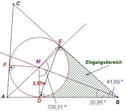 Zeichnen Sie die beiden Winkelhalbierenden und tragen Sie die Punkte M, D, E und F sowie die kreisförmige