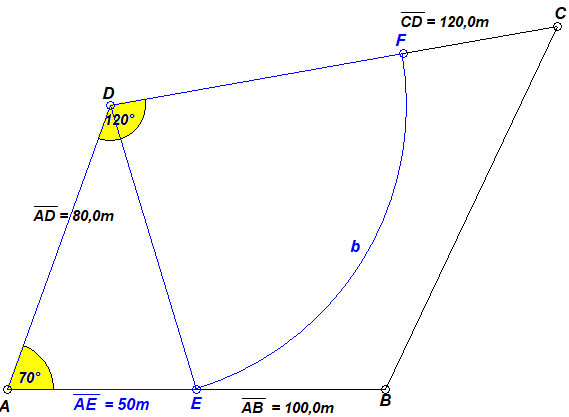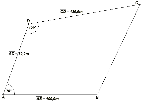 CD = 120,0m,∡BAD = 70,0°,∡ADC = 120,0°