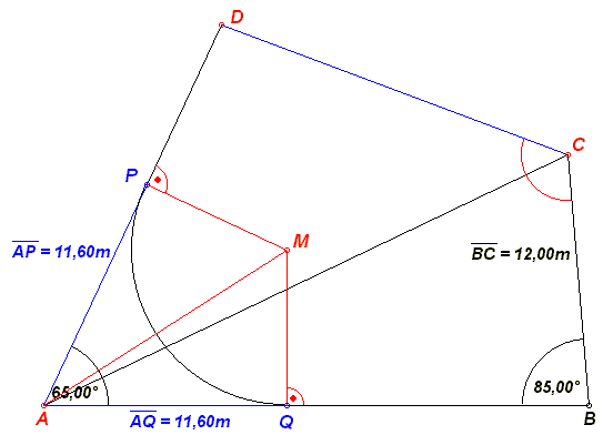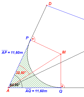 wird durch einen Kreisbogen mit dem Mittelpunkt M markiert. Der Kreisbogen berührt die Seiten [AB] im Punkt Q und [AD] im Punkt P jeweils 11,60 m