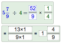 Convert the mixed number to a improper fraction, replace the division by a multiplication with the reciprocal fraction, and reduce the result.