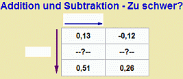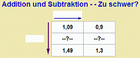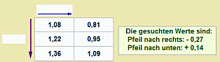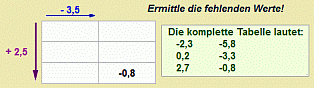 Das interaktive Arbeitsblatt beinhaltet eine weitere Übung, bei der die Schüler Werte in einer Tabelle ergänzen sollen. Bei dieser Aufgabe sind nun ein beliebiger Tabellenwert sowie die beiden Rechenvorschriften für die horizontale und vertikale Berechnung. Wird die Aufgabe fehlerhaft bearbeitet, so werden auch hier die falschen Werte rot hinterlegt und die Schüler aufgefordert, diese zu verbessern. Die Schüler haben wieder die Möglichkeit, sich die Lösungen einblenden zu lassen.