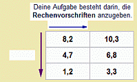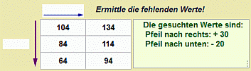 Das interaktive Arbeitsblatt beinhaltet eine abschließende Übung, bei der die Schüler wahlweise die Tabellenwerte oder die beiden Rechenvorschriften für die horizontale und vertikale Berechnung der Werte in einer Tabelle ergänzen sollen. Diese kann im Rahmen einer unterrichtlichen Differenzierung verwendet werden. Wird die jeweilige Aufgabe fehlerhaft bearbeitet, so werden wieder die falschen Werte rot hinterlegt und die Schüler aufgefordert, diese zu verbessern. Die Schüler haben auch hier die Möglichkeit, sich die Lösungen einblenden zu lassen.