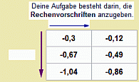 Das interaktive Arbeitsblatt beinhaltet eine neue Übung, bei der die Schüler die beiden Rechenvorschriften für die horizontale und vertikale Berechnung der Werte in einer Tabelle ergänzen sollen. Bei dieser Aufgabe ist die Tabelle jedoch nicht vollständig ausgefüllt; es fehlt die mittlere Reihe. Wird die Aufgabe fehlerhaft bearbeitet, so werden auch hier die falschen Werte rot hinterlegt und die Schüler aufgefordert, diese zu verbessern. Die Schüler haben wieder die Möglichkeit, sich die Lösungen einblenden zu lassen.