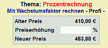Das interaktive Arbeitsblatt beinhaltet eine Übung, bei der die Schüler bei einer Rabattaktion bzw. einer Preisanhebung eines Möbelmarktes aus zwei gegebenen Werten den dritten ermiteln sollen. Dabei sind abwechselnd der alte Preis, der Rabatt bzw. die Erhöhung in % oder der neue Preis gefragt. Wird die Aufgabe fehlerhaft gelöst, so werden auch hier ein Lösungsweg, der den Begriff des Wachstumsfaktors verwendet und die Lösung selbst eingeblendet.