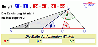 Das interaktive Arbeitsblatt beinhaltet eine Übung, bei der die Schüler drei fehlende Winkelmaße berechnen sollen. Gegeben ist ein Ausgangsdreieck, bei dem ein Winkelmaß konkret gegeben ist. Dieses Dreieck wird dann in drei gleichschenklige Dreiecke unterteilt.