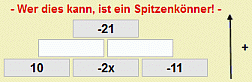 Das interaktive Arbeitsblatt beinhaltet eine weitere Übung, bei der die Schüler eine Gleichung in einer additiven Rechenmauer finden und lösen sollen. Die drei Grundsteine einer Grundmauer sind mit zwei Zahlen und jeweils einer Variablen belegt, die Zahl des Ergebnissteins ist vorgegeben. Die Aufgabe der Schüler besteht darin, die beiden Mittelsteine anzugeben, die Gleichung aufzustellen und dann die Variable und somit die Lösungsmenge zu bestimmen. Bei fehlerhafter Bearbeitung werden Lösungsweg und Lösung eingeblendet.