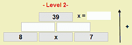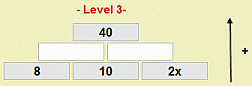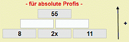 Das interaktive Arbeitsblatt beinhaltet eine weitere Übung, bei der die Schüler eine Gleichung in einer additiven Rechenmauer finden und lösen sollen. Die drei Grundsteine einer Grundmauer sind mit zwei Zahlen und jeweils mit einem Vielfachen einer Variablen belegt, die Zahl des Ergebnissteins ist vorgegeben. Die Aufgabe der Schüler besteht darin, die beiden Mittelsteine anzugeben, die Gleichung aufzustellen und dann die Variable und somit die Lösungsmenge zu bestimmen. Bei fehlerhafter Bearbeitung werden Lösungsweg und Lösung eingeblendet.