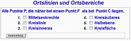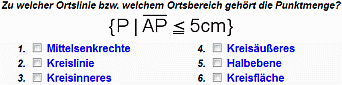 Das interaktive Arbeitsblatt beinhaltet eine Übung, bei der eine verbale Beschreibung einer geometrischen Ortslinie bzw. eines geometrischen Ortsbereichs gegeben ist. Die Schüler sollen dann aus den Möglichkeiten Kreislinie, Kreisinneres, Kreisäußeres, Kreisfläche, Mittelsenkrechte oder Halbebene die richtige Antwort auswählen. Bei fehlerhafter Bearbeitung wird die richtige Lösung ausgegeben.