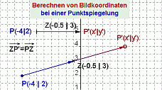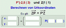 Das interaktive dynamische Arbeitsblatt beinhaltet eine Übung, bei der die Schüler aus den gegebenen Koordinaten des Bildpunktes und des Punktspiegelzentrums die Koordinaten des Urpunkts mittels Vektoren berechnen sollen. Bei fehlerhafter Bearbeitung werden auch hier sowohl die richtige Lösung als auch der vollständige Lösungsweg ausgegeben.