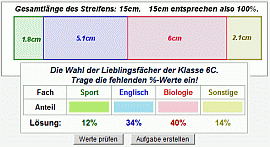 Das interaktive dynamische Arbeitsblatt beinhaltet eine Übung, bei dem ein bemaßtes Streifendiagramm gegeben ist. Die Aufgabe der Schüler besteht darin, aus den gegebenen Längen die zugehörigen Prozentsätze zu ermitteln. Bei fehlerhafter Lösung werden die richtigen Werte ausgegeben.