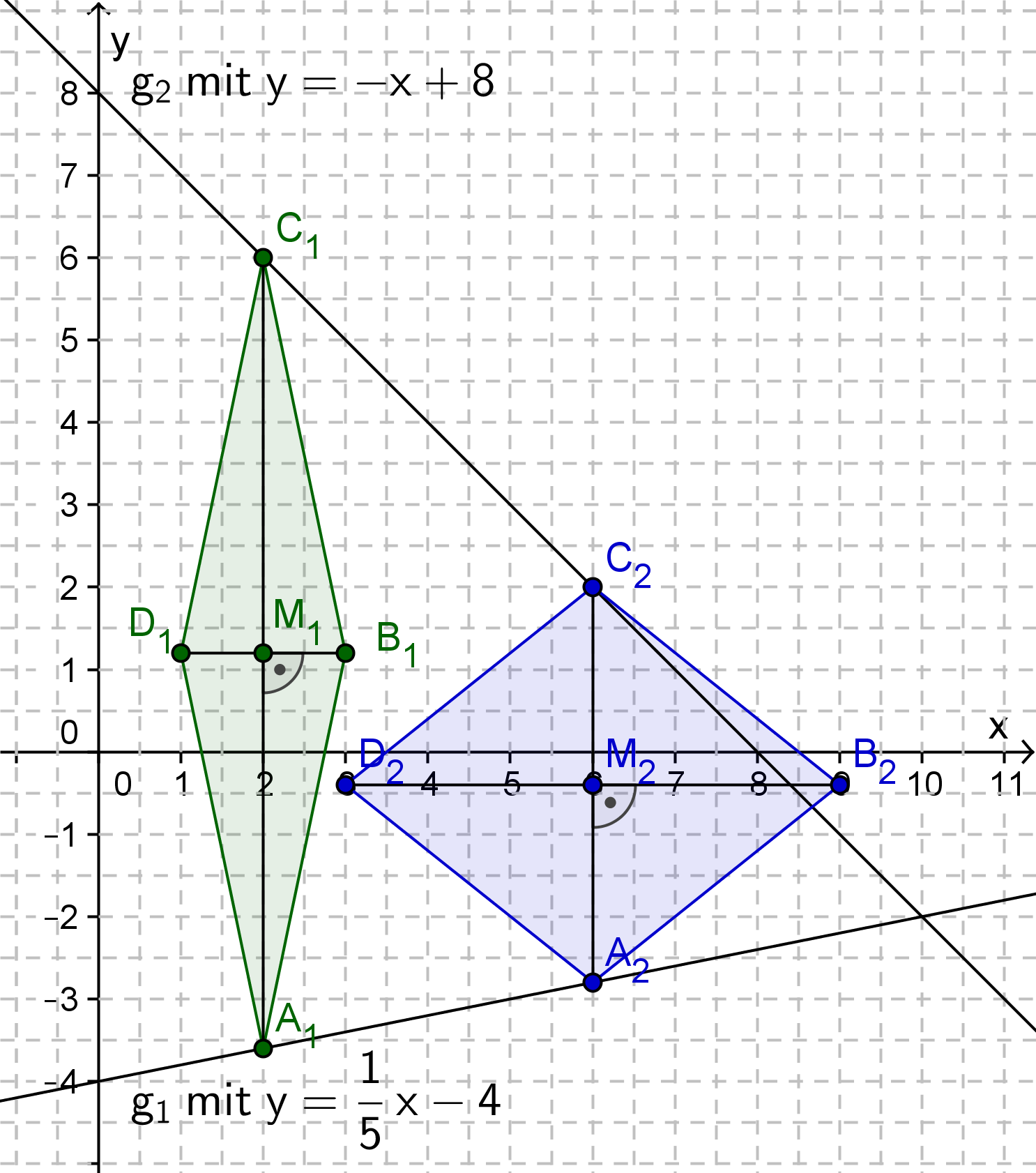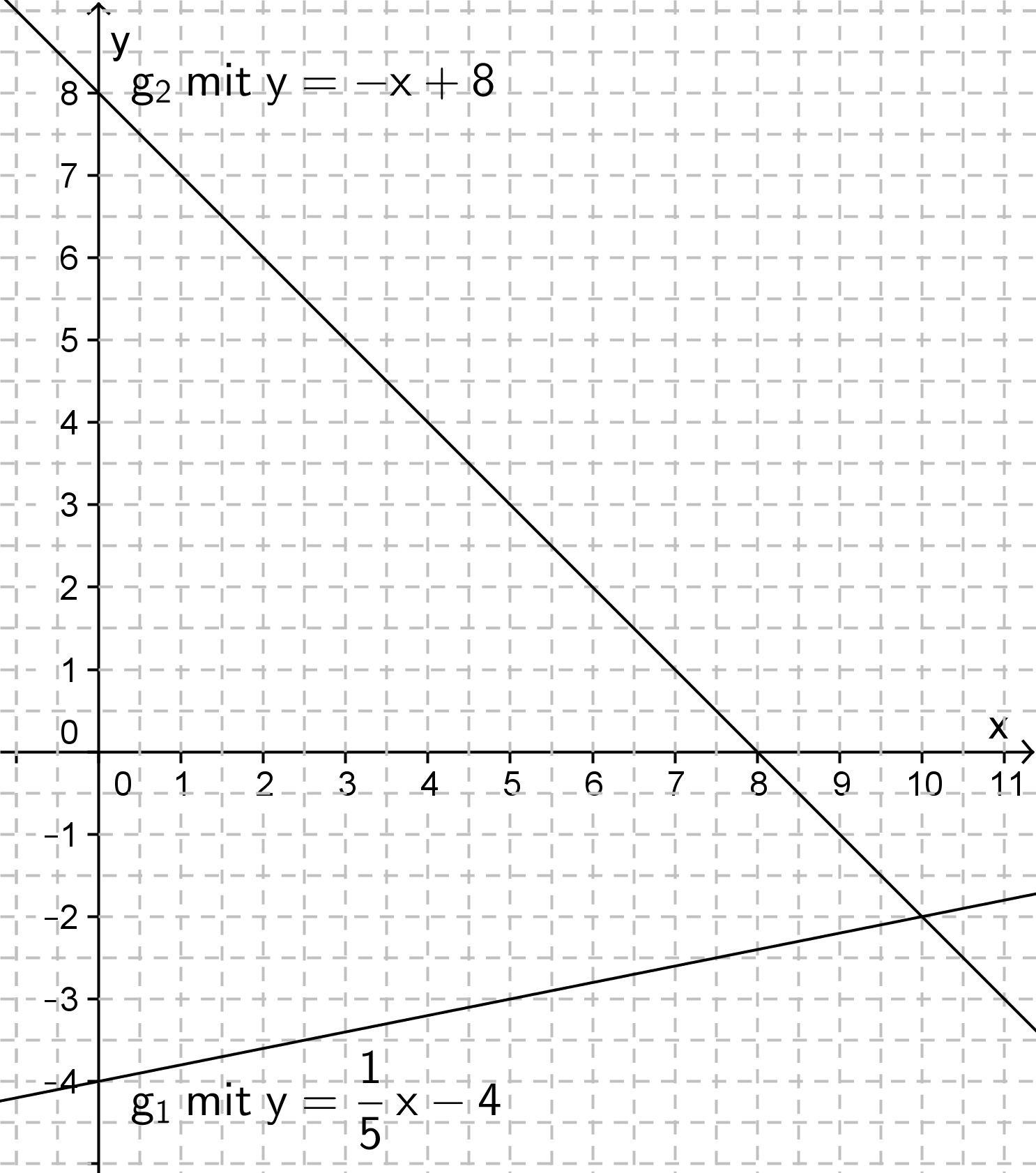 Die Gerade g1 hat die Gleichung y = 1/5 x - 4 und die Gerade g2 hat die Gleichung y = -x + 8.