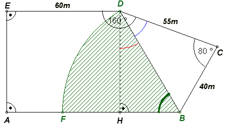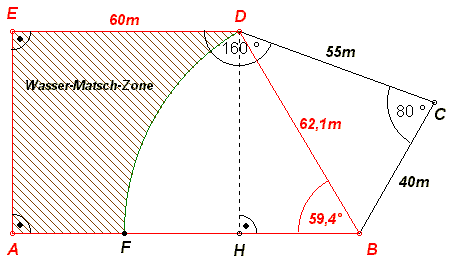 Angrenzend an den Geräteparcours wird eine Rasenfläche in Form eines Kreissektors mit dem Mittelpunkt B und dem Radius BD angelegt.