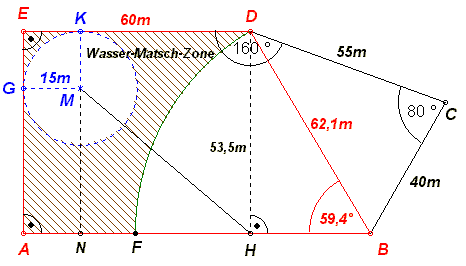 In einem Punkt M innerhalb der Wasser-Matsch-Zone wird eine Wasserfontäne angebracht, die bei maximalem Wasserdruck eine kreisförmige Fläche mit dem Durchmesser 30,0 m besprüht.