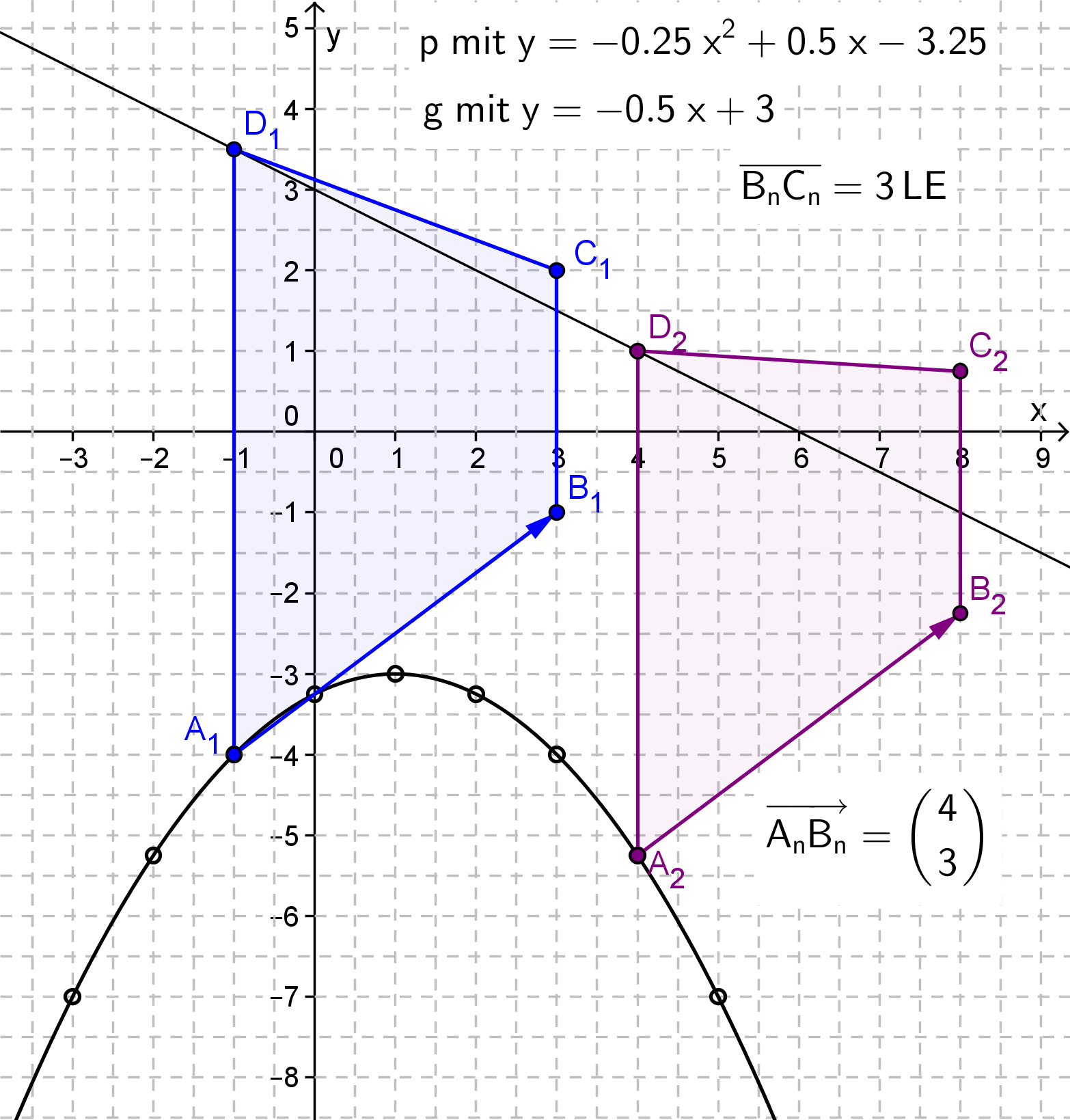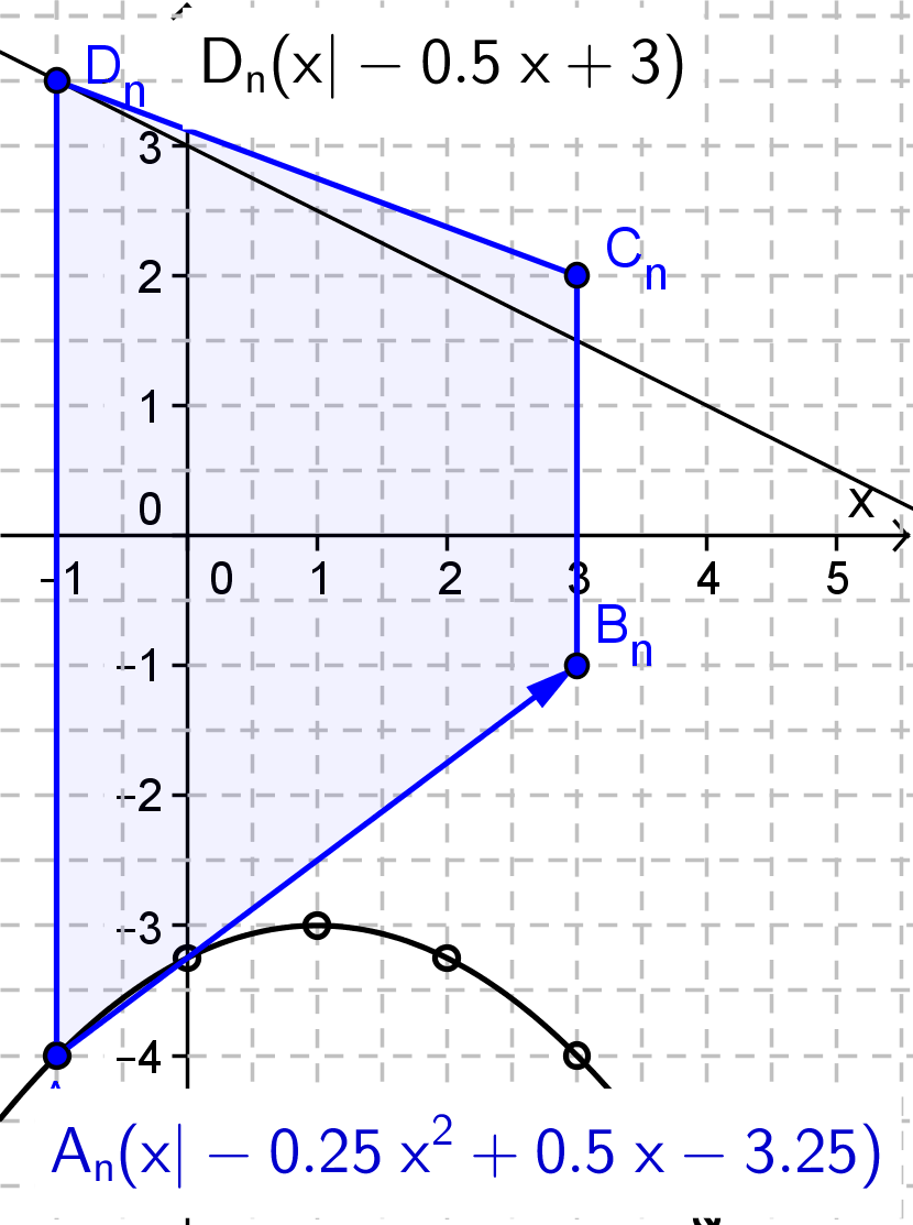 Punkte An(x | -0,25x2 +0,5x - 3,25) auf der Parabel p und Punkte Dn(x | -0,5x + 3) auf der Geraden g haben jeweils die gleiche Abszisse x. Sie bilden zusammen