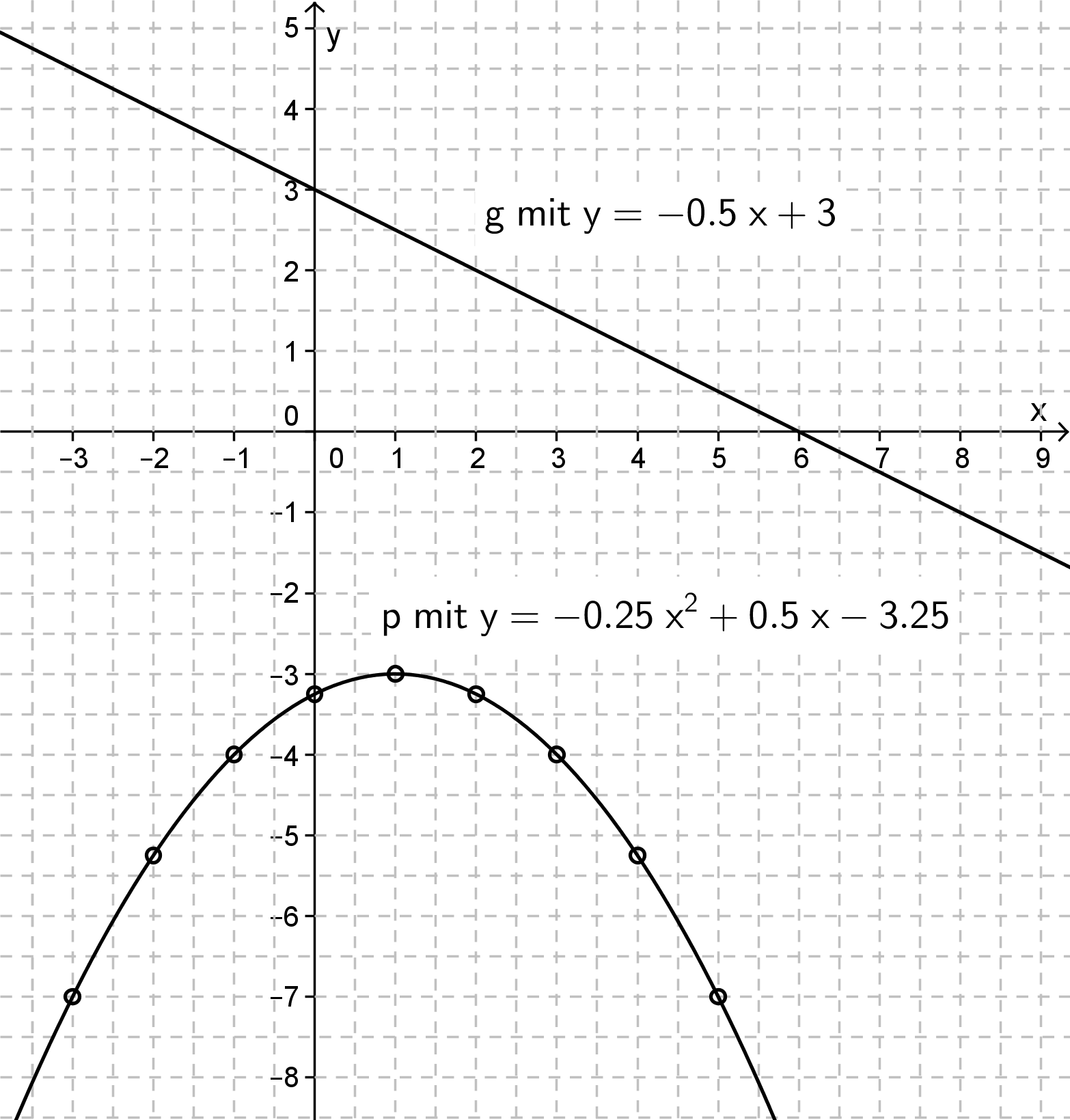 Somit ergibt sich die Gleichung p mit y = -0,25x2 + 0,5x - 3,25