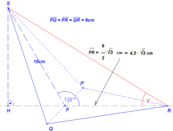 RS kannst du im Dreieck FRS mit Hilfe des Kosinussatzes