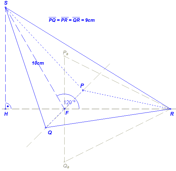 Der Punkt F ist der Mittelpunkt der Strecke [QP]. Der Fußpunkt H der Pyramidenhöhe [SH] liegt auf der Geraden FR.