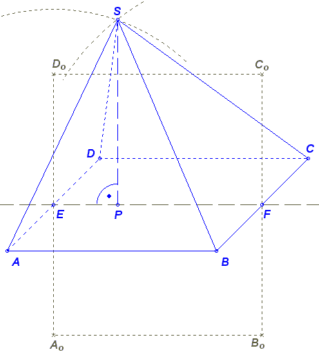 ist die Grundfläche der Pyramide ABCDS mit der Spitze S. Der Punkt E ist der Mittelpunkt der Seite [AD] und der Punkt F ist der Mittelpunkt der Seite [BC].